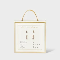Glam up your everyday or formal looks with the elegant style of the 14K Gold Plated Cubic Zirconia Duo Stud Earring Set from A New Day™. This set of stud earrings includes one with two cubic zirconia stones and one with four cubic zirconia stones to help create both understated and more noticeable looks. Each piece is designed in a gold tone for easy mixing and matching with your outfits, and boasts a nickel-free construction to suit all skin types. Add the pieces to your own accessory collection, or keep one for yourself and gift one to a loved one for any occasion.