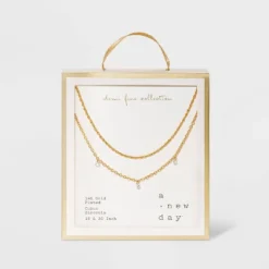 Add a little shine and sparkle to your outfits with the 14K Gold Plated Pierced Cubic Zirconia Duo Necklace from A New Day™. This cute combination of necklaces is made from 14K gold-plated nickel-free metal and features a rope-style chain design that adds a fun texture to your looks. Plus, the cubic zirconia stones bring a touch of dazzling shine and sparkle that coordinates with a range of color palettes and necklines. This duo necklace comes with a spring ring clasp to help secure it in place for comfortable wear.