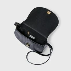 Add statement style to any of your looks with this Saddle Crossbody Bag from A New Day™. This black crossbody bag makes a handy and versatile essential that matches any outfit. It features a structured shape in a faux-leather finish with modern croc texture for a chic look. Complete with a push lock fastening on the main compartment, it opens to reveal an interior zipper pocket to keep your necessities neatly organized. The exterior slip pocket on the back provides easy access to your items, while the long adjustable shoulder strap makes carrying it super convenient and comfortable.