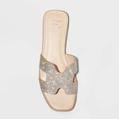 Add glamorous shine to your outfits with these Nina Rhinestone Flat Sandals from A New Day™. These faux-leather flat sandals feature a breezy open toe and back design that’s enhanced with a sparkly rhinestone-embellished strap running across the front. These comfy flat sandals come with a textured outsole and a slip-on style for ease of wear. Pair them with everything from maxi dresses to jumpsuits for effortless styling wherever you go.