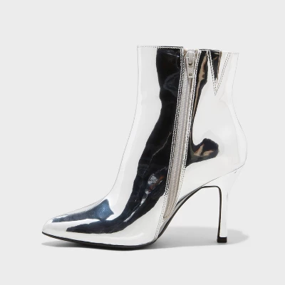 Add a bright pop of metallic magic to your footwear with these Shandra Ankle Boots from A New Day™. These pointed-toe boots feature a dazzling silver upper to add shimmer to your wardrobe, allowing you to shine on any occasion. Set on 3.25-inch stiletto heels for statement lift, the ankle boots have cushioned insoles and soft lining for comfortable wear, and a side zipper running down the shaft completes the look.