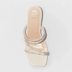 Elevate your look for special occasions with these Blakely Rhinestone Mule Heels from A New Day™. These light beige slip-on sandals feature an open-toe and back design for breathable comfort, plus a 2.25in block heel to add comfortable height to your look. The square-toe design adds a modern look, which is further enhanced by rhinestone-embellished straps running across the front. Pair them with everything from floor-length dresses to jumpsuits for effortless styling wherever you go.