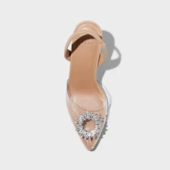 Elevate your style to dazzling heights with these Misty Slingback Heels from A New Day™. Set on 3.5-inch stiletto heels for statement lift, these pointed-toe heels feature a transparent vamp embellished with a sparkly wreath-like motif. Designed with a slingback ankle strap for a fashion-forward look, they’re perfect for dates or a night out on the town.